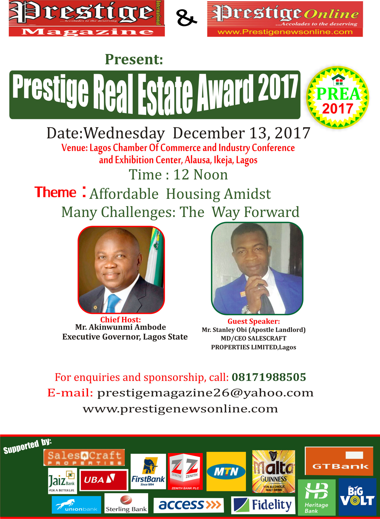 Governor of Lagos State, Mr. Akinwunmi Ambode and top players in real estate have been penned down for recognition in the 2017 edition of the Prestige Real Estate Award (PREA) for their giant strides in hospitality cum housing sector of the economy.