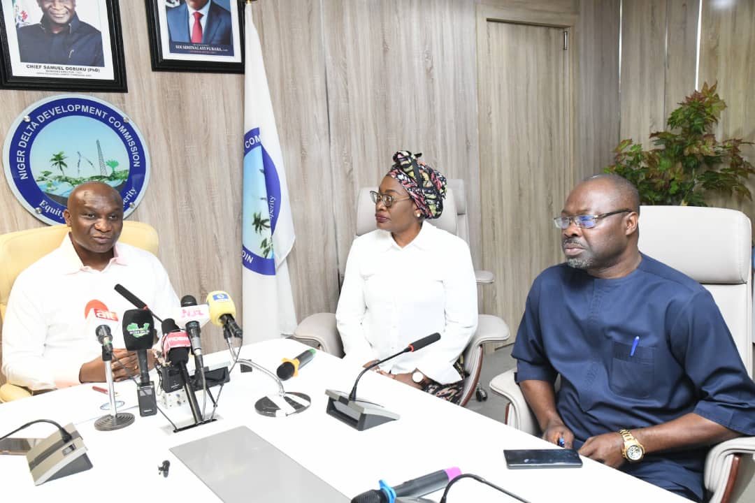 The NDDC Managing Director, Dr Samuel Ogbuku, addressing newsmen during an interactive session at the Commission’s headquarters in Port Harcourt. With him are the NDDC Director, Corporate Affairs, Mrs. Seledi Thompson-Wakama (second left) and the Special Assistant, media to the MD, Dr Willie Etim (right).