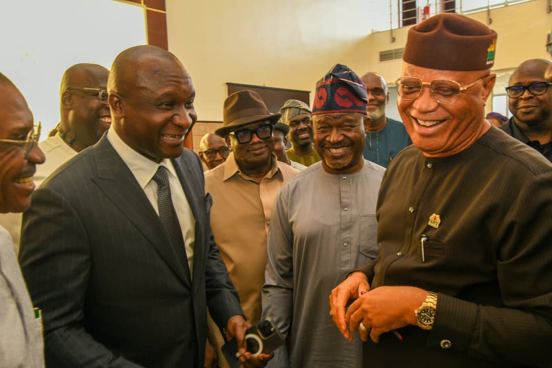 The Governor of Akwa-Ibom State, Pastor Umo Eno (right), exchanging pleasantries with the NDDC Managing Director, Dr Samuel Ogbuku (left), during a courtesy visit at the Akwa-Ibom State Government House, Uyo. With them are the NDDC Executive Director Projects, Sir Victor Antai (3rd right) and the NDDC Executive Director Corporate Services, Hon. Ifedayo Abegunde (2nd right).