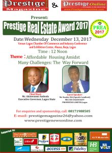 Governor of Lagos State, Mr. Akinwunmi Ambode and top players in real estate have been penned down for recognition in the 2017 edition of the Prestige Real Estate Award (PREA) for their giant strides in hospitality cum housing sector of the economy.