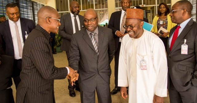 L-R: Executive Director, Asset Management Corporation of Nigeria (AMCON), Dr. Eberechukwu Uneze (left); Managing Director/Chief Executive Officer, AMCON, Mr. Ahmed Lawan Kuru in a handshake with the Chairman of Independent Corrupt Practices and Other Related Offences Commission (ICPC), Prof. Bolaji Owasanoye; Board Chairman, AMCON Dr. Muiz Banire SAN and Executive Director, Operations, AMCON, Mr. Aminu Ismail, when AMCON visited ICPC in Abuja