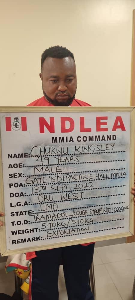 In the same vein, NDLEA operatives had on Tuesday 13th Sept. intercepted another trafficker, Chukwu Kingsley on his way to Rome, Italy on an Asky Airline flight. A search of his luggage shows he had concealed among food condiments 11,460 tablets of tramadol 225mg with a gross weight of 5.7kg and 39 bottles of codeine syrup. The 49-year-old suspect is a known haulage agent who hails from Oru West Local Government Area of Imo State.