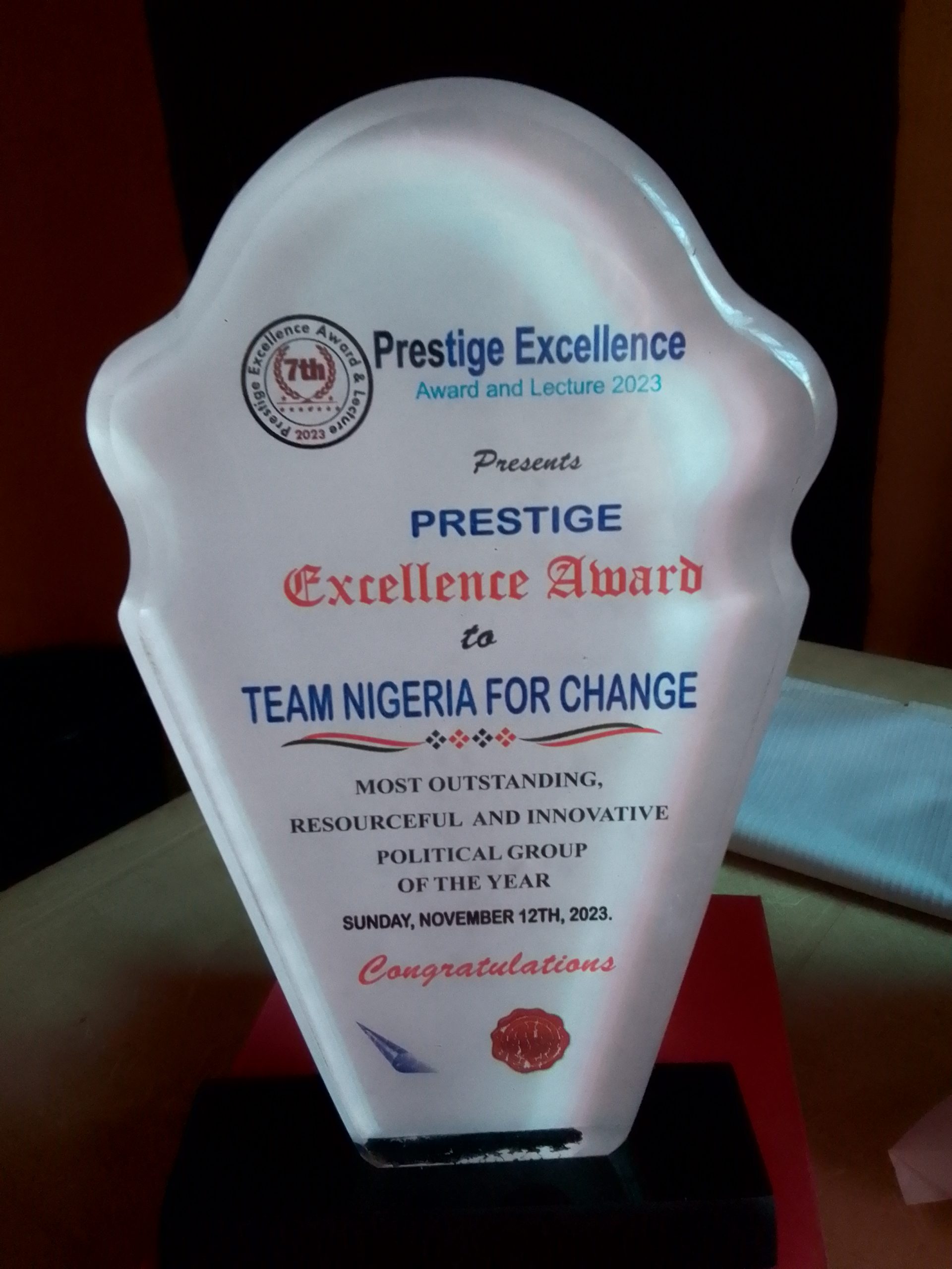 TeamNigeria4Change for change under his leadership has contributed immensely towards nation building and national development through good governance advocacy, community interventions and providing support for the less privileged. TeamNigeria4Change won Most Outstanding, Resourceful and Innovative Political Group of the year at Prestige Excellence Award and Lecture 2023.