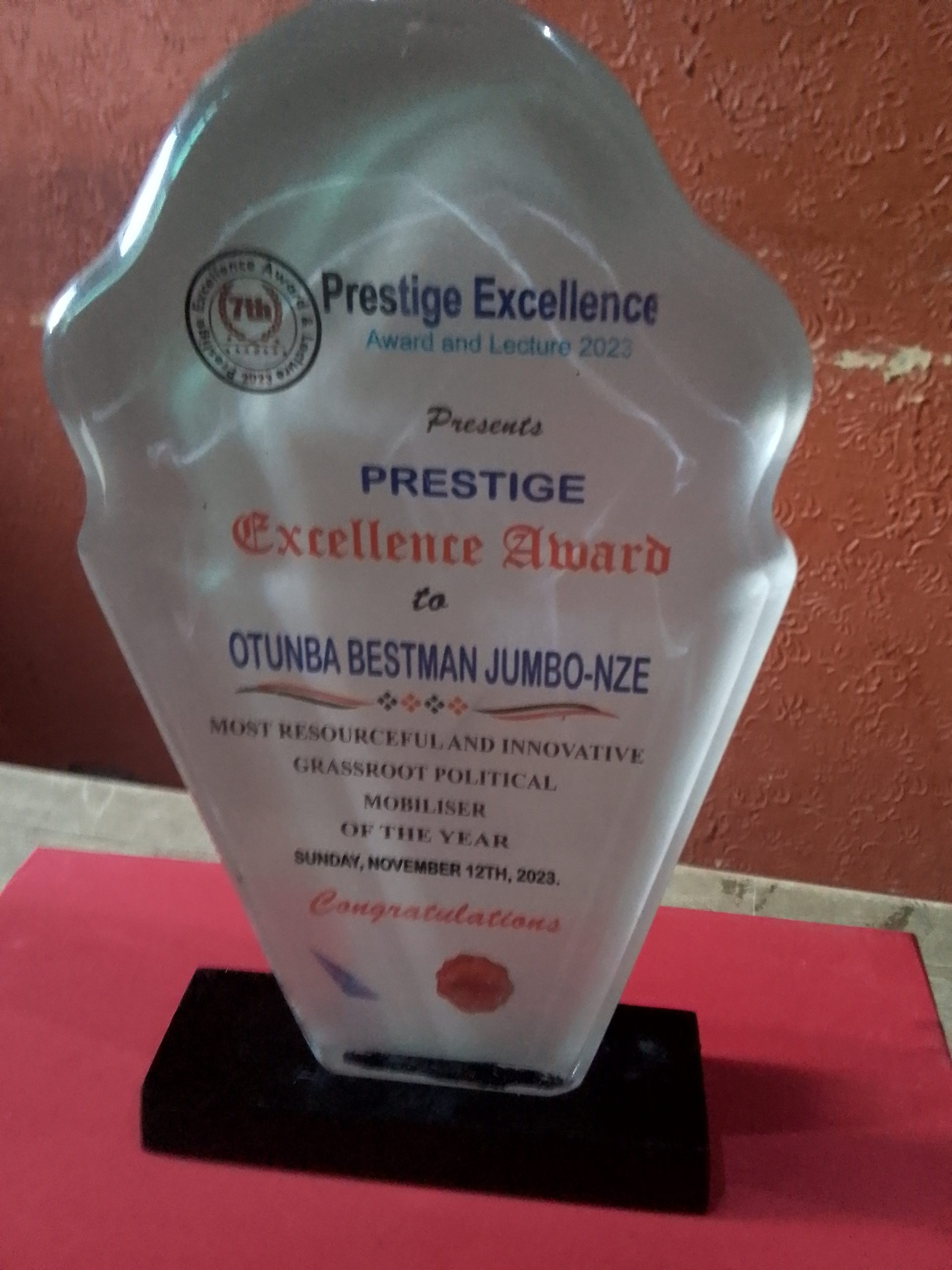 He won Most Resourceful and Innovative Grassroot Political Mobiliser of the year at Prestige Excellence Award and Lecture 2023.