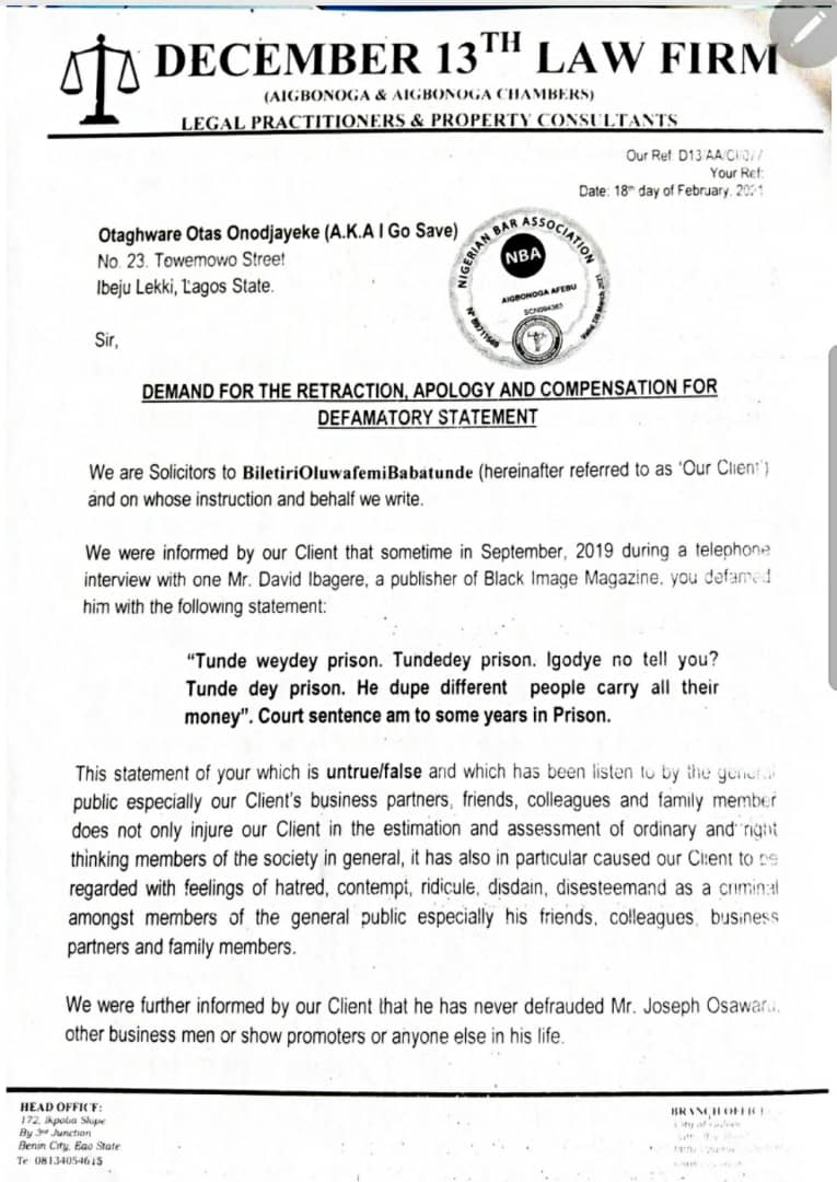 BILETIRI TUNDE SLAMS COMEDIAN I GO SAVE WITH #500 MILLION LAW SUIT FOR DEFAMATORY STATEMENT