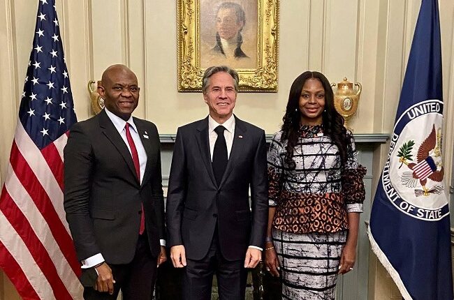 Founder, Tony Elumelu Foundation and Group Chairman, United Bank for Africa(UBA), Tony Elumelu, CFR; United States Secretary of State, Anthony Blinken; and Co-Founder, Tony Elumelu Foundation, Dr. Awele Elumelu, at the opening reception hosted by U.S. State Department and Tony Elumelu Foundation, at the ongoing U.S.-Africa Leaders’ Summit in Washington on Monday.