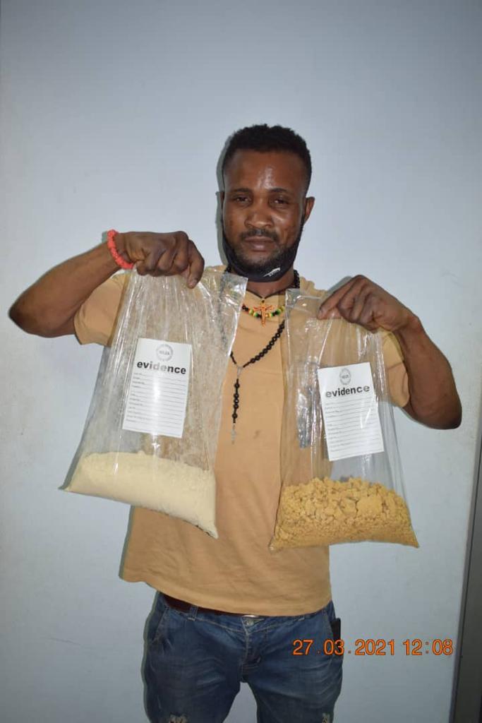 A drug trafficker, Goodluck Igbineweka Odeh has been intercepted at the Nnamdi Azikiwe International Airport, Abuja, NAIA, with 2kilogramme of heroin, which has a street value of N564million, concealed in the lining of false bottom of his suitcase.