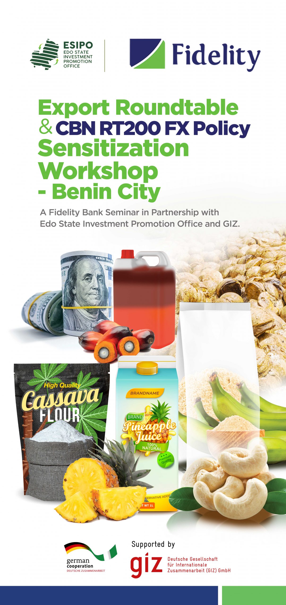Leading financial institution, Fidelity Bank Plc, has announced plans to host an exports roundtable and policy sensitisation workshop for businesses in Benin-City, Edo State capital in partnership with the Edo State Investment Promotion Office (ESIPO) and GIZ on Tuesday, 24 May 2022.