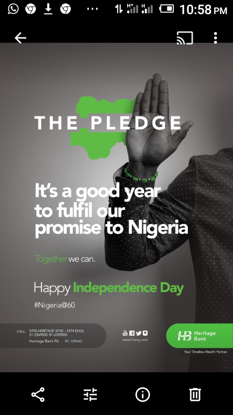 In a statement confirming the significance of reciting the National Pledge in Pidgin English and the need to reward loyalty to the country, the Divisional Head, Corporate Communications, Fela Ibidapo affirmed that as a bank that places much importance and value on our national heritage, “we want to remind Nigerians of their loyalty and commitment to the nation; thereby imbibe the patriotic spirit in citizens that despite the challenges, it has been 60years of dignity and pride as individuals, who together, make up this great country called Nigeria.”