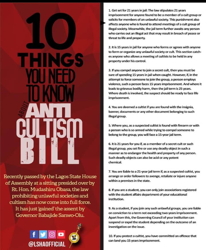 1. 21-years jail term: The law stipulates a jail term of 21 years for anyone found to be a member of a cult group or solicits for members of an unlawful society. The same punishment goes for persons who attend meetings of a cult group as well as those who carry out acts capable of endangering the lives of residents.