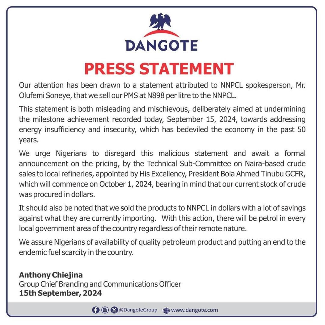“We urge Nigerians to disregard this malicious statement and await a formal announcement on the pricing, by the Technical Sub-Committee on Naira-based crude sales to local refineries, appointed by His Excellency, President Bola Ahmed Tinubu GCFR, which will commence on October 1, 2024, bearing in mind that our current stock of crude was procured in dollars.