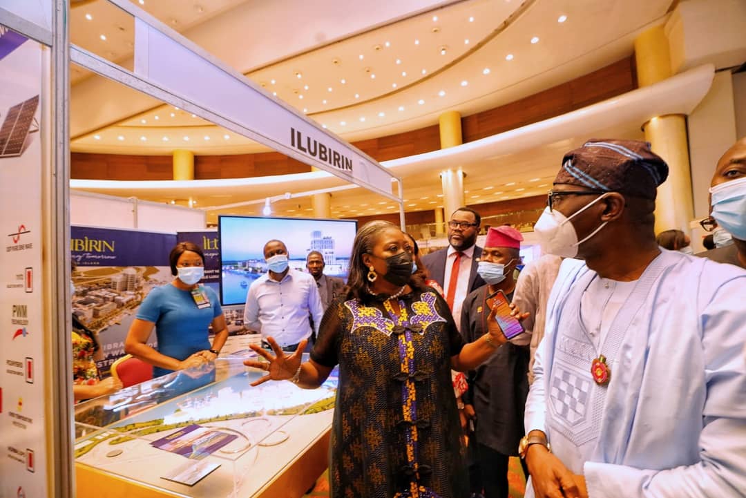 Special Adviser to the Governor on Housing, Mrs. Toke Benson-Awoyinka (left) with Lagos State Governor, Mr. Babajide Sanwo-Olu during a tour of exhibition stands at the opening of the Maiden Real Estate Marketplace Conference and Exhibition at Eko Hotel & Suites, Victoria Island on Wednesday, December 9, 2020.