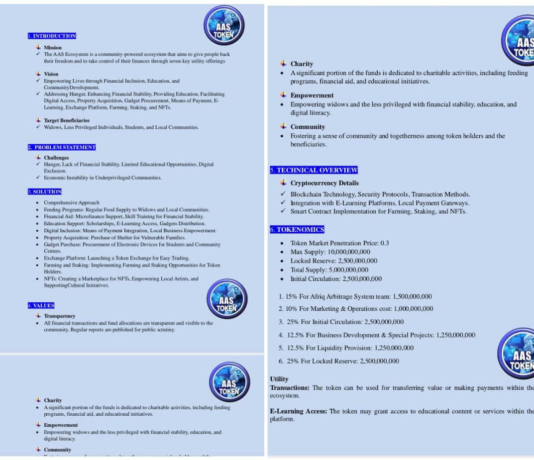 The beauty of the global coin known as the AAS token is its universal usage. With the launch of global coin, partners or investors can trade, invest, buy, and sell products. The launch of this AAS merchandise marketplace enables users to buy and sell products using AAS tokens. The aim is that investors can now use it to make payments and transactions using AAS tokens. AAS coin can be used in purchasing iPhones, iPad and laptop in AAS App Store, Air ticket, Transport ,AAS codding/programming school ,AAS tracking system ,AAS Estate.