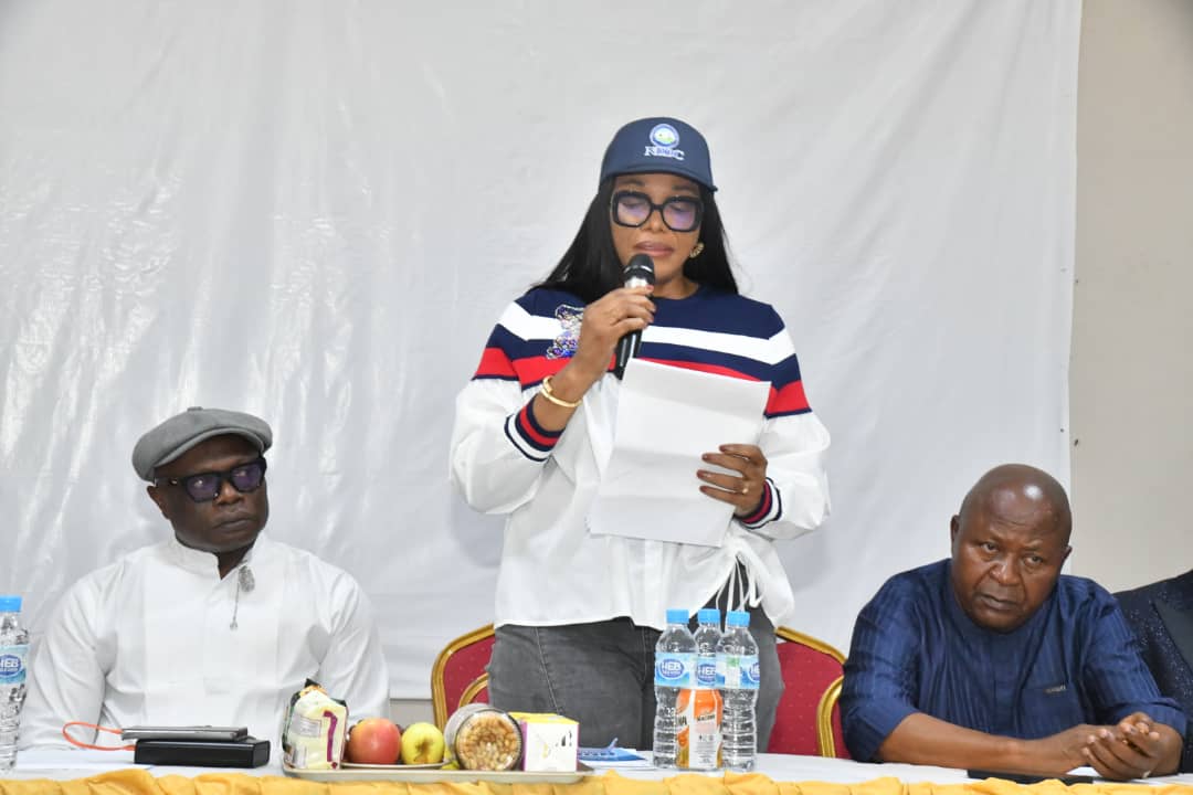 The NDDC Director, Agriculture and Fisheries, Dr Winifred Madume (middle) speaking during the flag-off of Training and Empowerment of Women and Youths in Livestock and Agro-Processing in Amukpe, Delta State. With her is Director III, Agric & Fisheries, Mr. Tonye Frank-Oputu, (left) and the Delta State Representative in NDDC, Hon. Monday Igbuya (right).