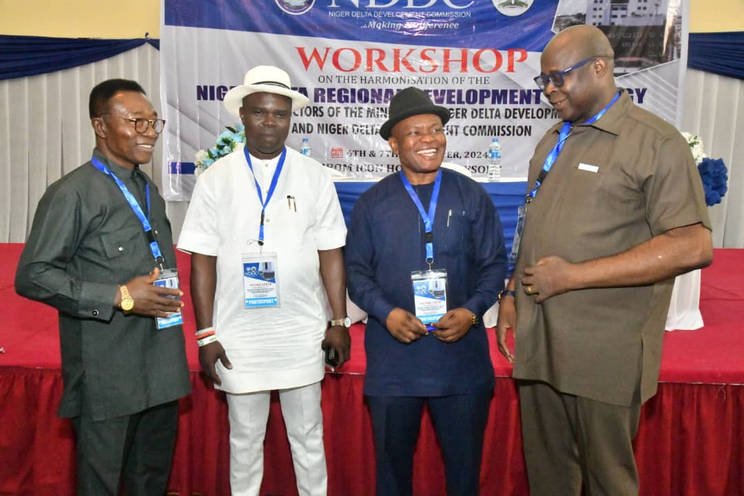 L-R: Director, Reform-Coordination & Service Improvement, Min. of Niger Delta Development, Dr. Osueke Chidi; Director, NDDC Administration & Human Resources; Mr. Patrick Ekade; MNDD Director, Planning Research & Statistics, Mr. Paul Abia and his NDDC counterpart, Mr. Davies Okarievu, during the workshop for directors of both establishment in Uyo, Akwa Ibom State.