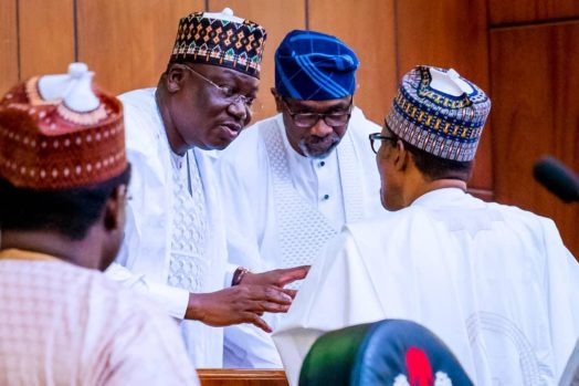 President of the Senate and Chairman of the National Assembly, Ahmad Ibrahim Lawan; Speaker of the House of Representatives, Rt (Hon.) Femi Gbajabiamila, and President Muhammadu Buhari, during the 2020 Budget presentation by the President at the National Assembly on Tuesday, 8th October, 2019.