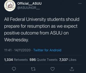The tweet read: “ All Federal University students should prepare for resumption as we expect a positive outcome from ASUU on Wednesday.”