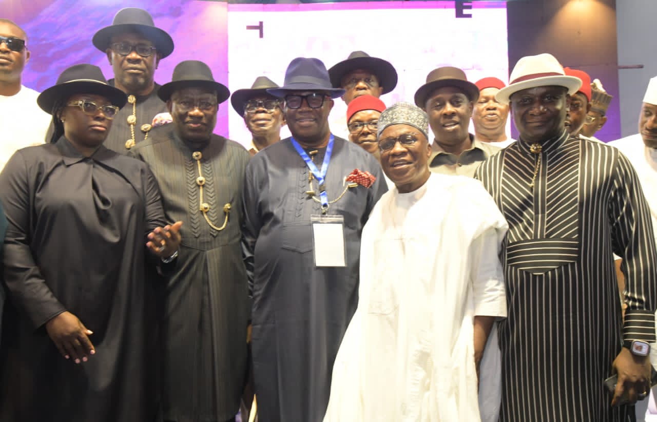 . L-R: Hon, Erhiatake Ibori-Suenu, Former President of Nigeria, Dr Goodluck Jonathan; the Senate, Chief Godswill Akpabio, the Minister for Niger Delta Development, Engr. Abubakar Momoh, the NDDC Managing Director, Dr Samuel Ogbuku, at the Niger Delta Stakeholders Summit 2024 in Port Harcourt.