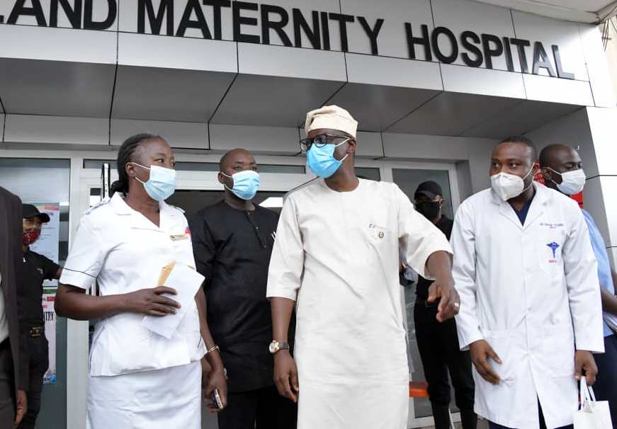 L-R: Lagos State Governor, Mr. Babajide Sanwo-Olu (middle), Senior Registrar (Obstetrics), Dr. Olusola Togunde (right) and Assistant Nursing Officer, Oniyitan Christiana Kehinde (left) during the Governor’s visit to Lagos Island Maternity Hospital, on Friday, July 31, 2020