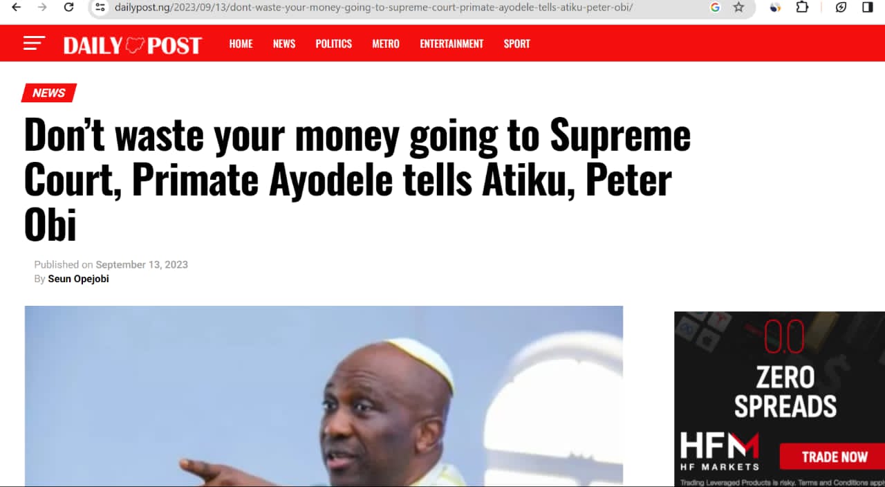 ‘’Going to the Supreme Court is like throwing a billion naira into the fire. I told them Tinubu was ready but they didn’t listen. Peter Obi and Atiku cannot win at the Supreme Court; they should forget it and wait for another election. They ought to have learnt their lessons now so they can prepare well for the next election.’’ (https://pmnewsnigeria.com/2023/09/10/dont-waste-your-money-forget-about-supreme-court-primate-ayodele-tells-atiku-peter-obi/)