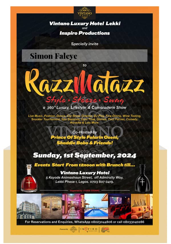 Mr. Asoo Mitra, the General Manager of Vintano Hotel, expressed his excitement about the forthcoming event, stating, “We are thrilled to be the venue for this edition of RAZZMATAZZ on September 1st, a truly unique and upscale event that embodies the spirit of luxury, leisure and sophistication. Prince Folarin Oseni and Shaddie Bobo are undoubtedly masters at creating memorable experiences, and we are confident that this event will be nothing short of same. Since opening a few months back, Vintano Hotel has been consistently dedicated to hosting top-tier events and we also looking forward to warmly welcome all the invited guests to join us for this talk of the town event.”