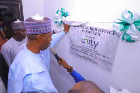 A building donated by Unity Bank Plc to the Borno State Universal Basic Education Board, SUBEB. Borno State Governor, Prof. Babagana Umara Zulum inspecting the plaque during the official commissioning of the SUBEB building donated by Unity Bank.