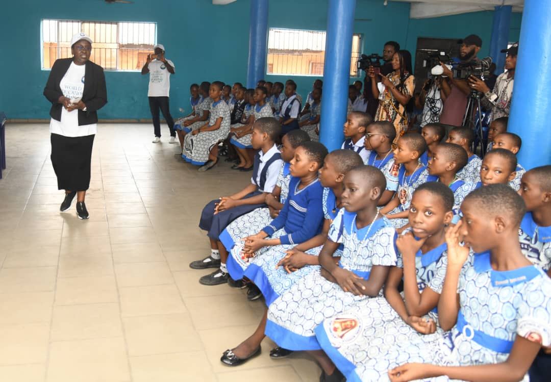 The NDDC Director of Education, Dr (Mrs.) Awele Chukwudifu (left) addressing students of St. Mary’s Model School, Port Harcourt, as part of the sensitisation activities for World Education Day 2025.