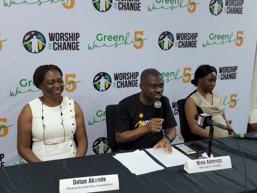 Green Worship 2: The Founder of Puresouls Learning Foundation, Mrs. Dotun Akande; The Convener and Chief Responsibility Officer, Worship4Change, Pastor Wale Adenuga; and Founder, Cerebral Palsy Kids Learn Foundation, Tobiloba Ajayi, during the press conference to create awareness for this year’s ‘Green Worship 5.0’, a benefit concert in support for indigent children, orphans and children with special needs, organised by Worship4Change, in Lagos on Thursday