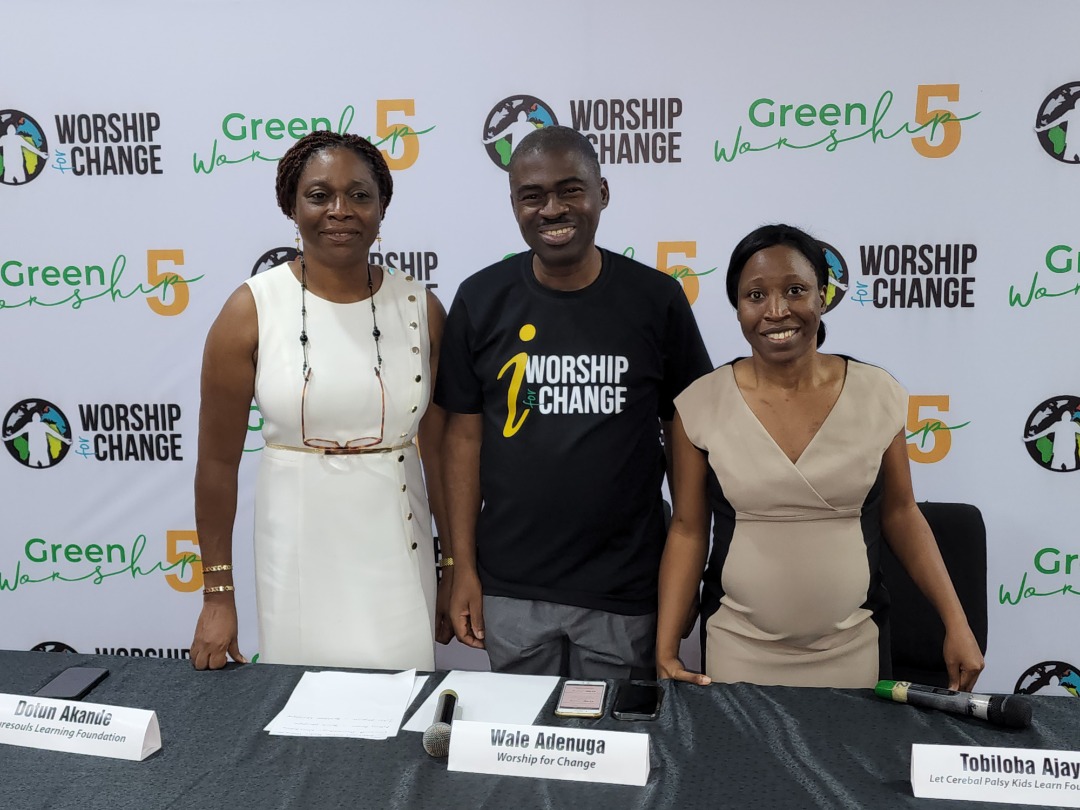 Green Worship 1: The Founder of Puresouls Learning Foundation, Mrs. Dotun Akande; The Convener and Chief Responsibility Officer, Worship4Change, Pastor Wale Adenuga; and Founder, Cerebral Palsy Kids Learn Foundation, Tobiloba Ajayi, during the press conference to create awareness for this year’s ‘Green Worship 5.0’, a benefit concert in support for indigent children, orphans and children with special needs, organised by Worship4Change, in Lagos on Thursday